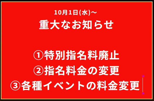 10月1日特別指名料廃止および各種イベントの料金変更のお知らせ